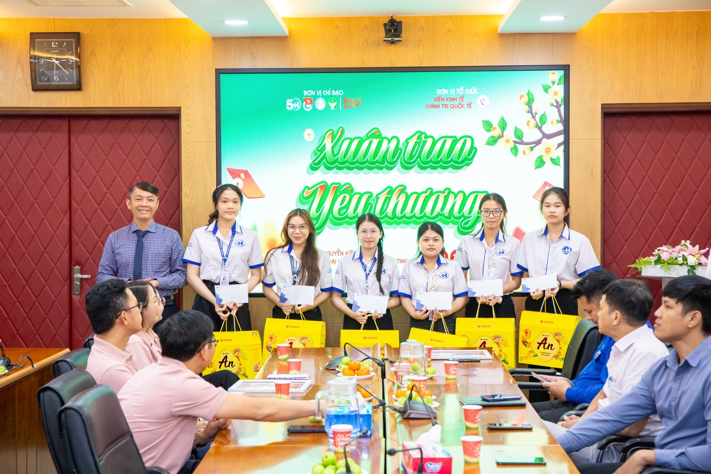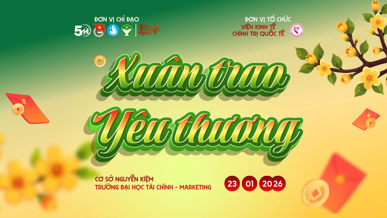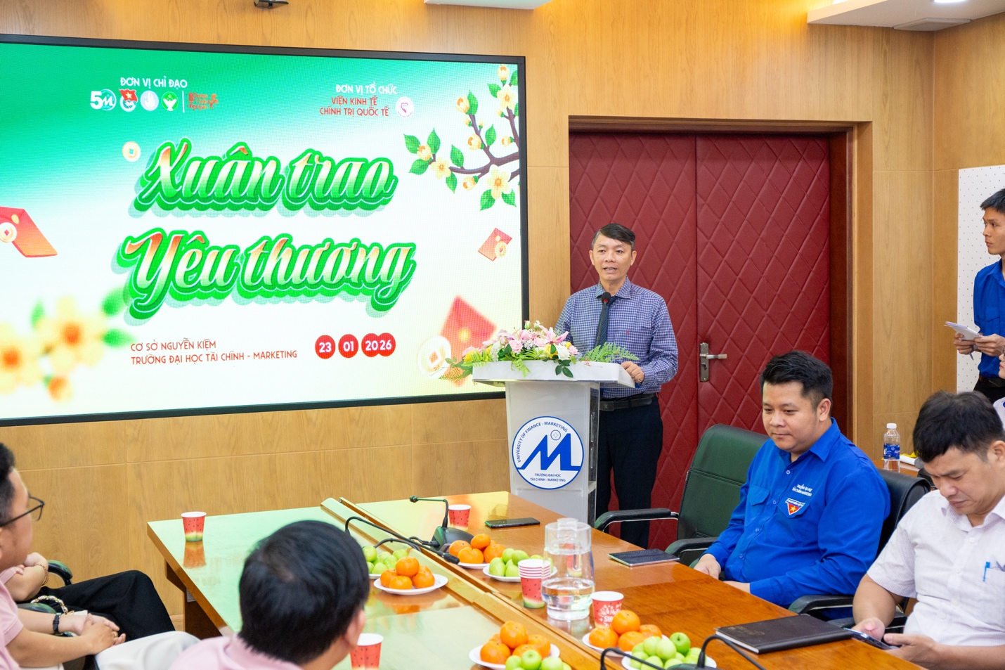 Sáng ngày 23/01/2026, tại Phòng A.303, Trụ sở 778 Nguyễn Kiệm, Trường Đại học Tài chính - Marketing, chương trình “Xuân trao yêu thương” do BCH Đoàn - LCH sinh viên Viện Kinh tế Chính trị Quốc tế (Viện KTCTQT) tổ chức đã diễn ra trong không khí ấm áp, trang trọng và đầy ý nghĩa. Chương trình là hoạt động thiết thực trong khuôn khổ Chiến dịch Xuân Tình nguyện năm 2026, hướng đến chăm lo, hỗ trợ sinh viên có hoàn cảnh khó khăn, sinh viên có gia đình chịu hậu quả bão lũ năm 2025 nhân dịp Tết Nguyên đán Bính Ngọ 2026.